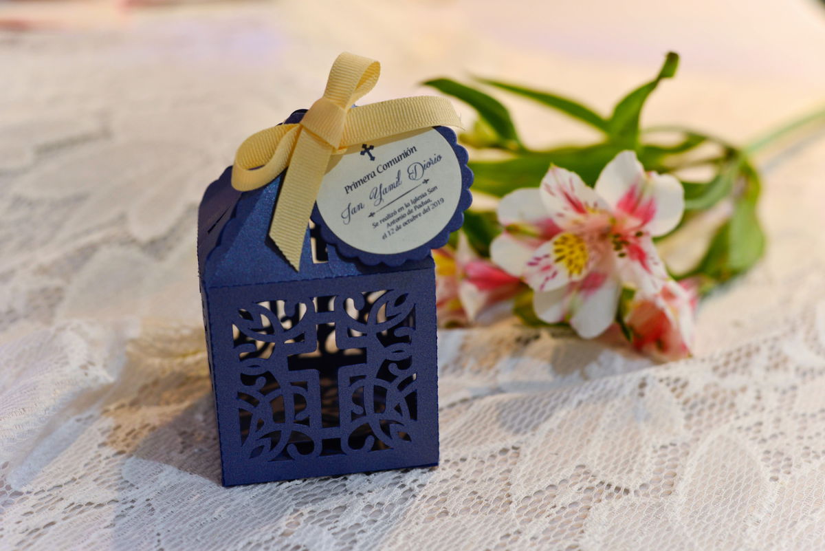 Descubre la elegancia de nuestra Caja calada muy delicada. Este exclusivo modelo combina una delicada estructura con una hermosa cinta y tags personalizados, todo elaborado con cartulinas italianas de alta calidad.