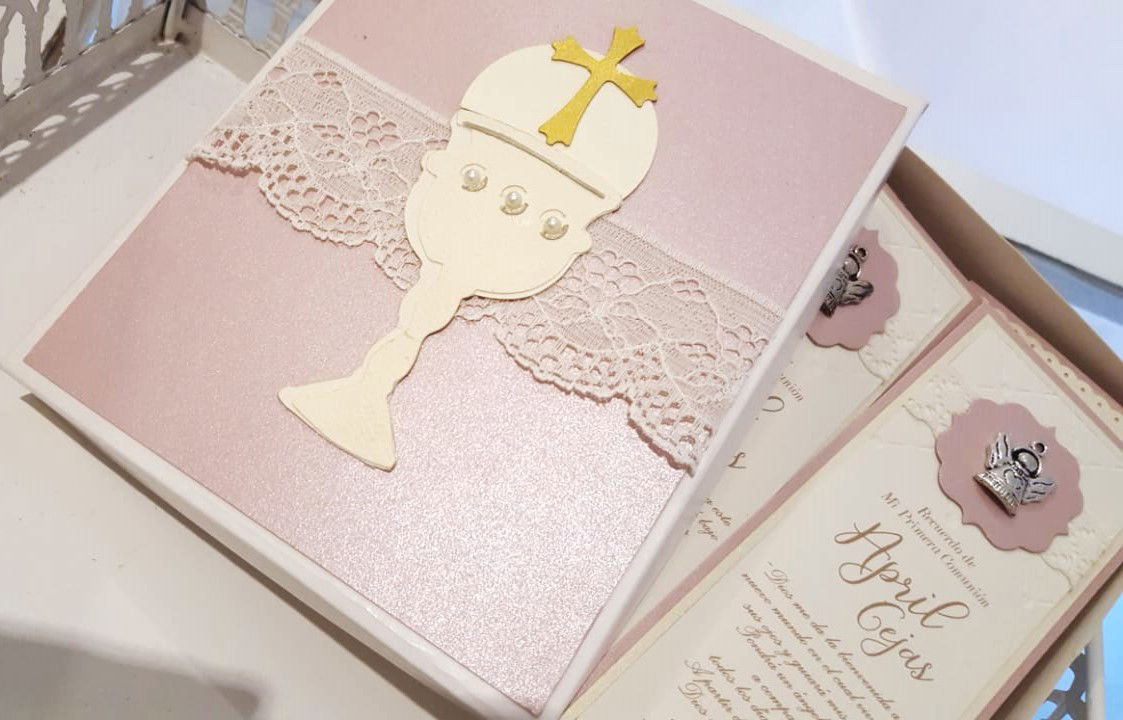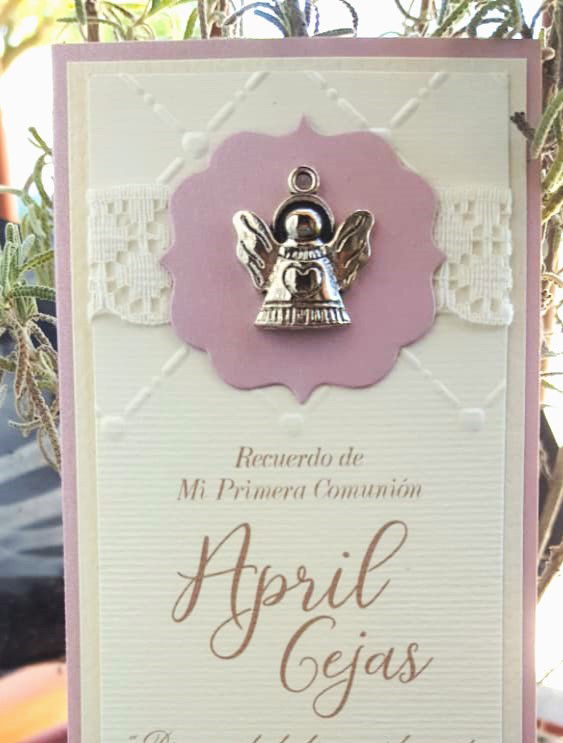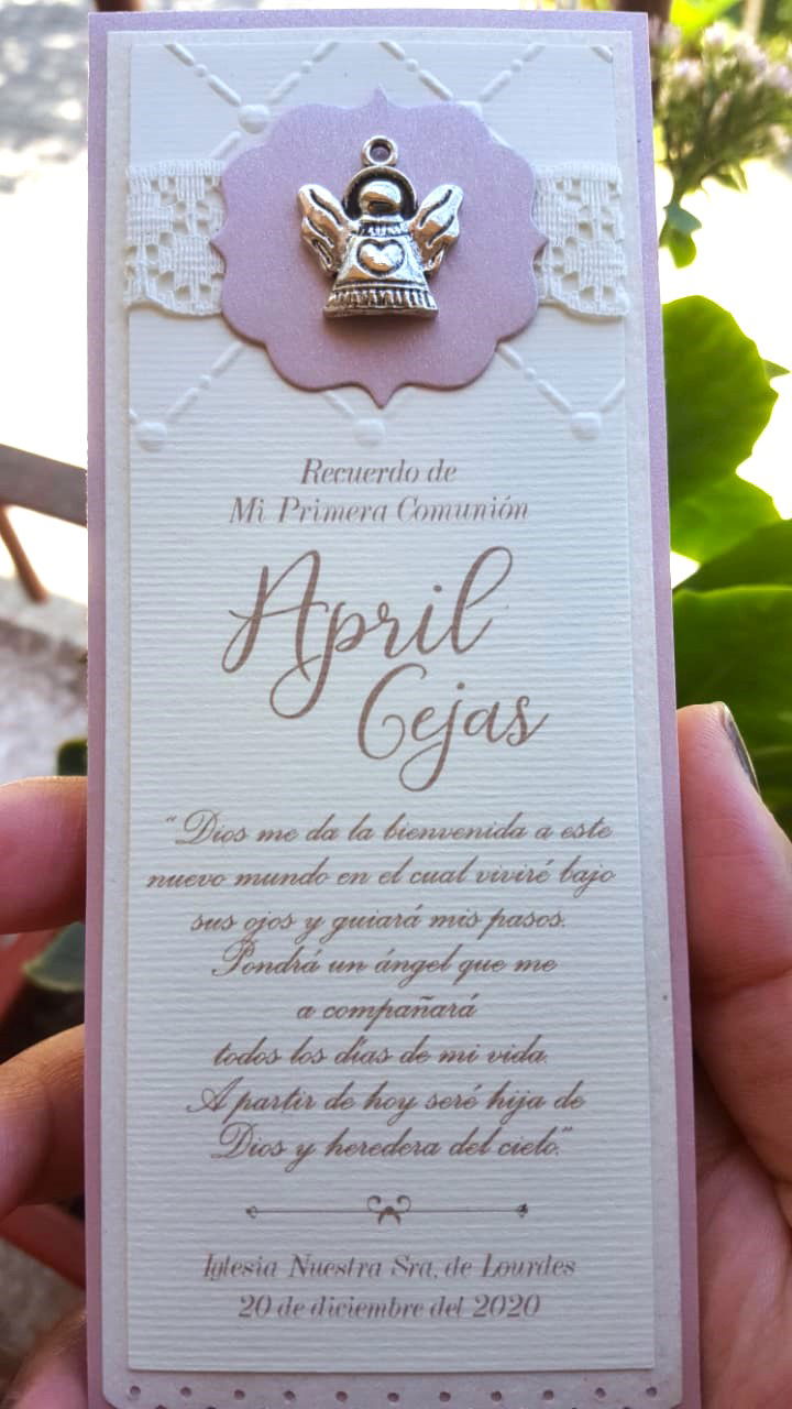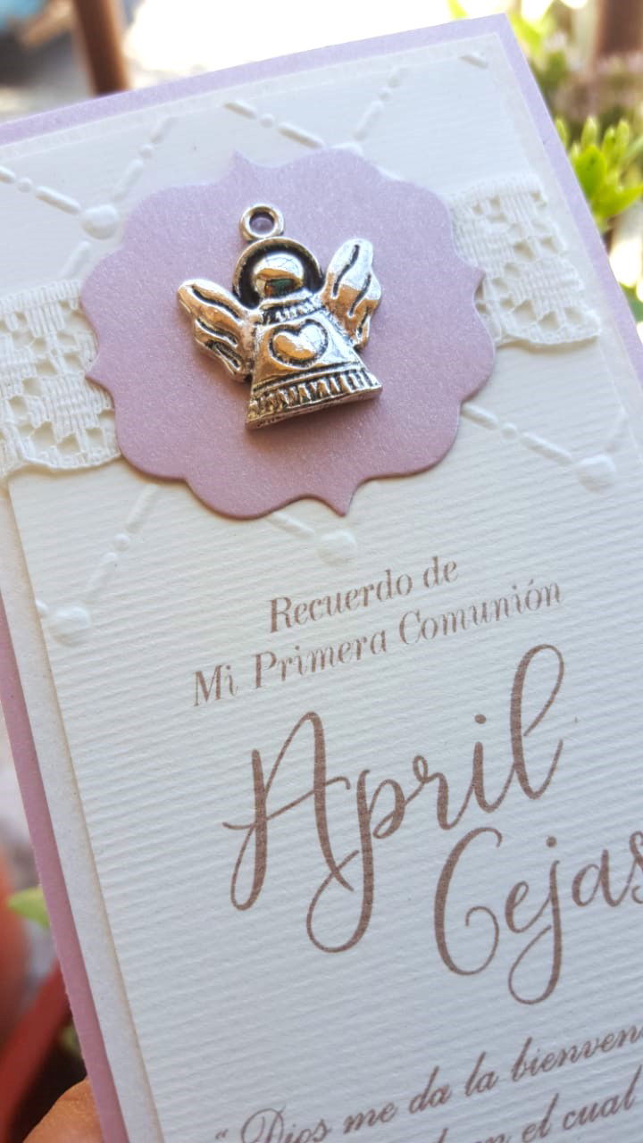 Descubre la elegancia de nuestra Esquela con aplique, dije, textura, perforado y cinta o puntilla. Este diseño presenta una delicadoa puntilla mas una textura en el superior, aplique y dije.